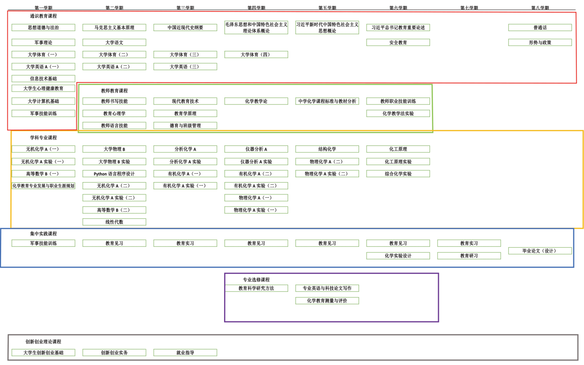 基础化学实验(无机化学、有机化学、物理化学、分析化学)、化工原理实验、化学教学法实验、综合化学实验、大学物理实验、教育见习、教育研习、教育实习、毕业论文(设计)。