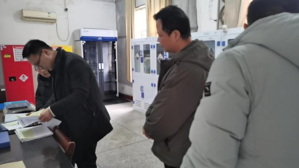 2024年1月11日上午,娄底市教育局安全科室一行在校武保处段楠科长带领下深入学校危化品室,检查由材料与环境工程学院负责的“易制毒,易制爆”系统。危化品室管理员丁常泽、刘晓林陪同检查。
