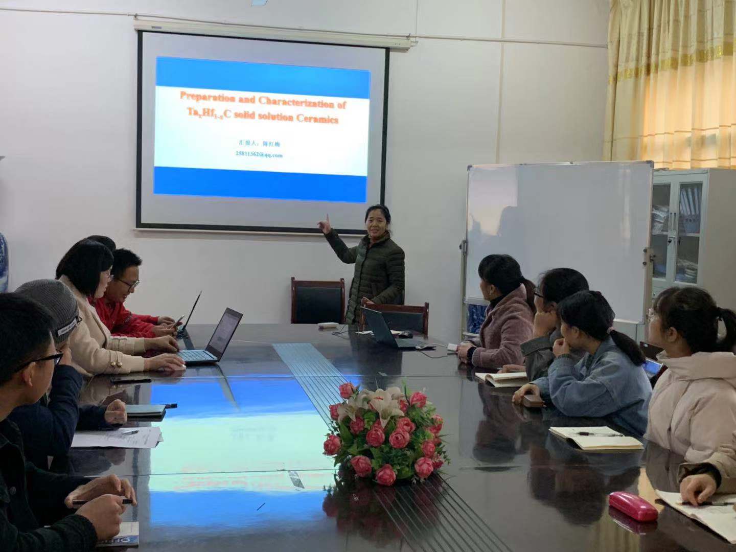 最后,教研室陈红梅讲师结合自己在国防科技大学博士后期间的研究工作,做了题为“Preparationand Characterization of TaxHf1-xC solid solution Ceramics”的学术报告。报告从国防科技发展对超高温陶瓷的需求出发,首先汇报了超高温陶瓷的概念、性能特点以及典型应用,然后介绍了具有最高熔点的TaxHf1-xC固溶陶瓷的性能与国内外研究现状,最后重点介绍了国防科技大学在TaxHf1-xC固溶陶瓷制备及性能表征方面取得的最新进展。