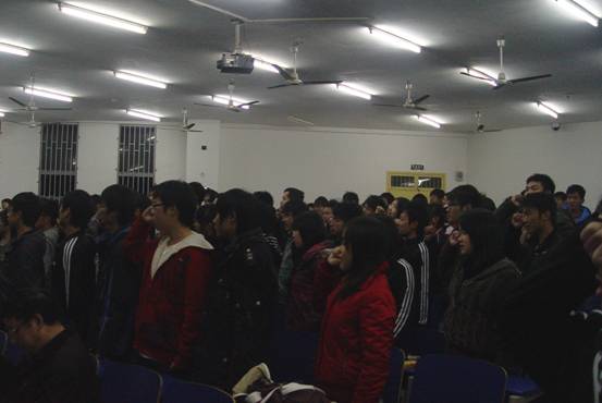 大会于晚上7:30正式开始,出席会议的有系党总支书记余为,系主持行政工作副主任李家其教授,系党总支副书记刘桂英,辅导员邓莉立、陈佩君老师,相应班级班主任,部分学生干部代表和10级全体同学。