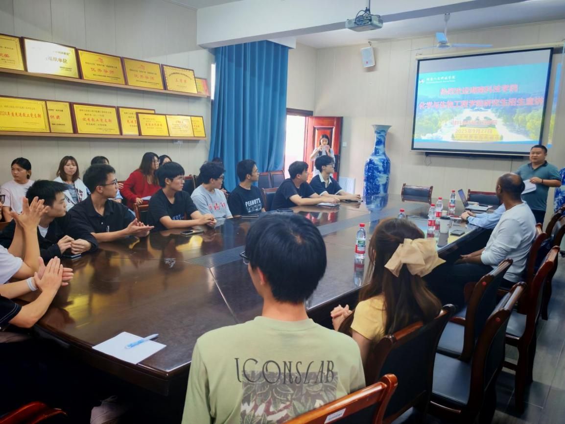 2025年9月27日,湖南科技学院化学与生物工程学院院长覃佐东一行三人莅临我院开展硕士研究生招生宣讲,宣讲会于多闻楼410举行,材料与环境工程学院学院院长文瑾、副院长陈红军、就业专干刘晗及学院有考研意向的学生共同参加此次宣讲。