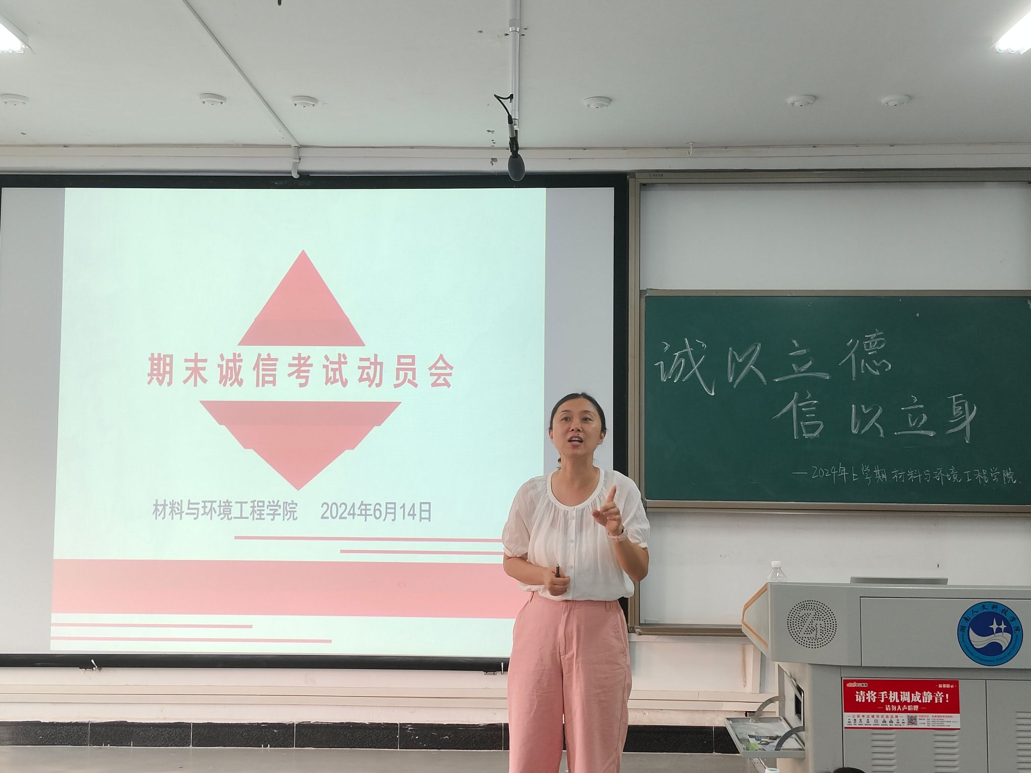 2024年6月14日,材环院在致远楼409召开了2024年上学期期末诚信考试动员大会。材料与环境工程学院党总支书记钟勇、学工办主任朱舒腊、团总支书记李璐玢、辅导员何欢老师以及全体班长、学委和团支书参会。