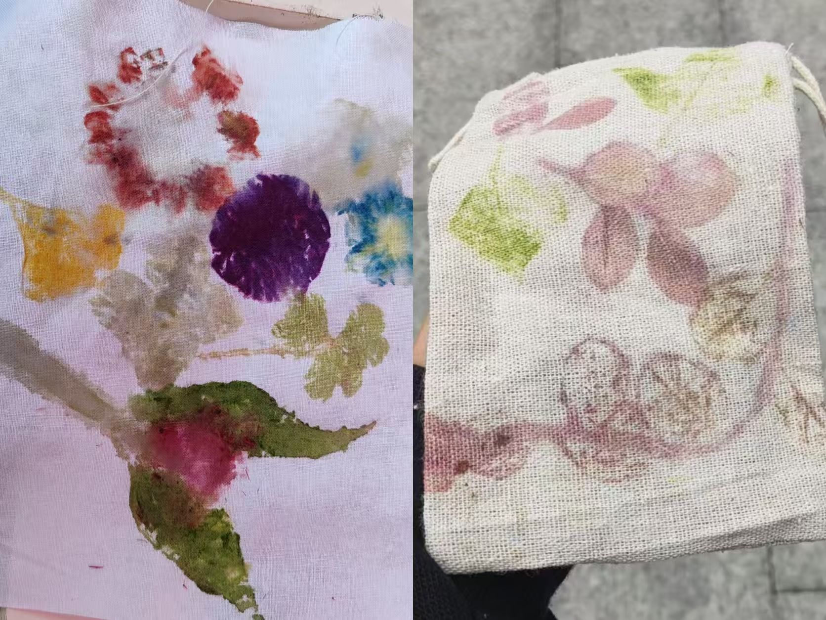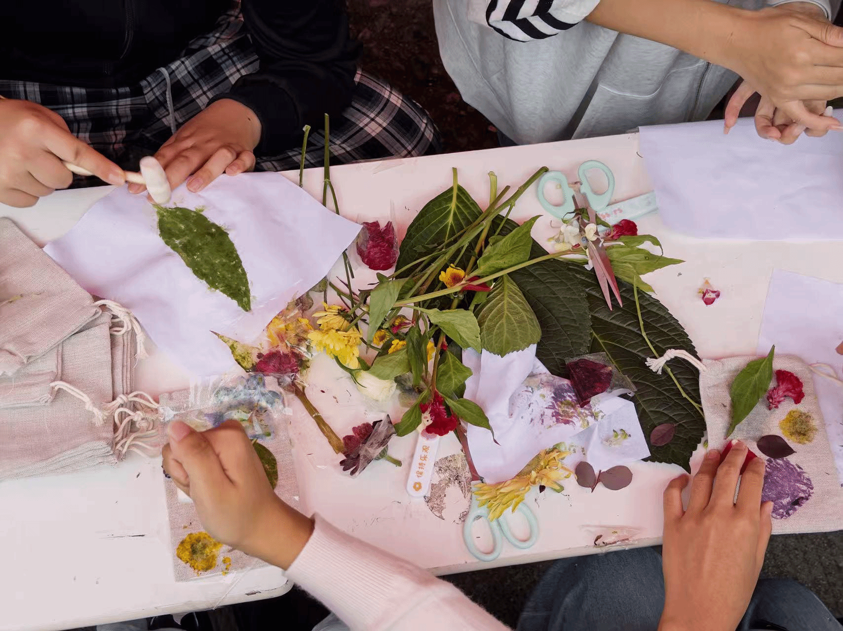 活动现场,同学们挑选心仪的叶片和花瓣,润湿后在手帕或帆布袋上进行创意布局,再用木锤轻敲拓印。清脆的敲击声中,植物的色彩与纹理在织物上绽放出自然之美。辅导员也积极参与其中,现场氛围轻松愉快。通过亲手创作,同学们不仅体验了传统拓染工艺的魅力,也在专注与创作中释放压力、平复心绪。