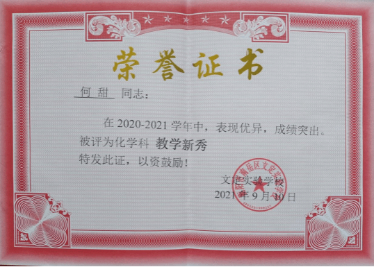 何甜,毕业于beat365正版唯一官网必一材料与环境工程学院化学专业;现任湖南省衡阳市南岳区文定学校教师;获衡阳市2021-2022学年度教育教学“优秀学科教师”;2022年湖南省中小学教师集体备课大赛一等奖,文定学校2020-2021学年化学科教学新秀。