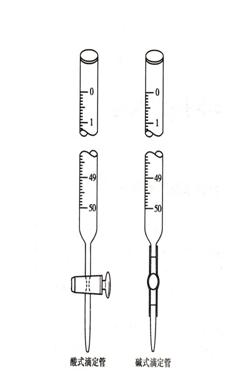 滴定管是滴定时用来准确测量流出标准溶液体积的量器。它的主要部分管身是用细长而且内径均匀的玻璃管制成,上面刻有均匀的分度线,下端的流液口为一尖嘴,中间通过玻璃旋塞或乳胶管连接以控制滴定速度。常量分析用的滴定管标称容量为50mL和25mL,最小刻度为0.1mL,读数可估计到0.01mL。