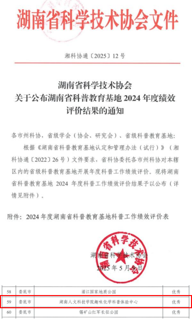 2025年5月9日,湖南省科学技术协会公布 2024 年度湖南省科普教育基地绩效评价结果,beat365正版唯一官网必一趣味化学科普体验中心在此次评估中表现突出,获评“优秀”等次。