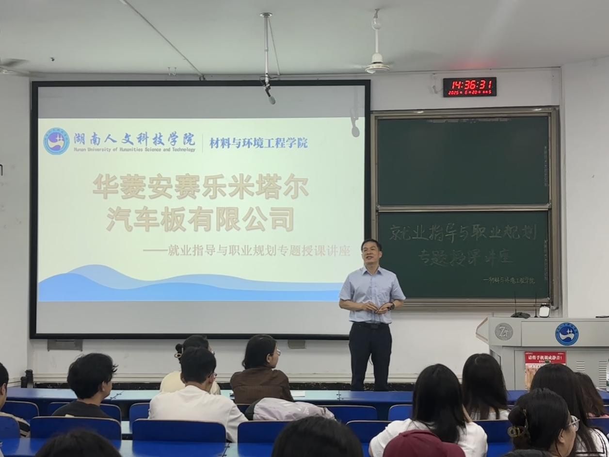 6月20日下午,材料与环境工程学院在致远楼119成功举办就业指导与职业规划专题讲座。本次讲座特邀华菱安赛乐米塔尔汽车板有限公司贺先贵经理担任主讲嘉宾,学院党总支副书记王新辉、陈畅亚博士及 2022 级全体学生共同参与。