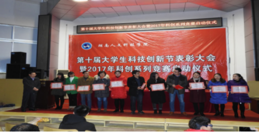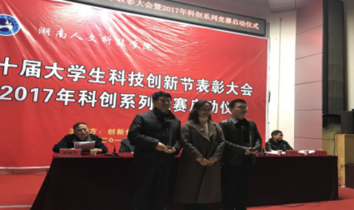 12月20日晚,第十届大学生科技创新节表彰大会暨2017年科创系列竞赛启动仪式在匠成楼报告厅隆重举行,副校长石潇纯,副校长周发明、副校长陈志国、副校长刘铁峰,教务处、科研处、研究生处、宣传部、评建办、团委、创新创业学院等部门负责人,各二级学院党政负责人、分管创新创业工作领导、创新创业专干,科创系列赛事评委、获奖师生代表,校级学生组织代表近500人参加了大会。创新创业学院彭晓华院长主持会议。