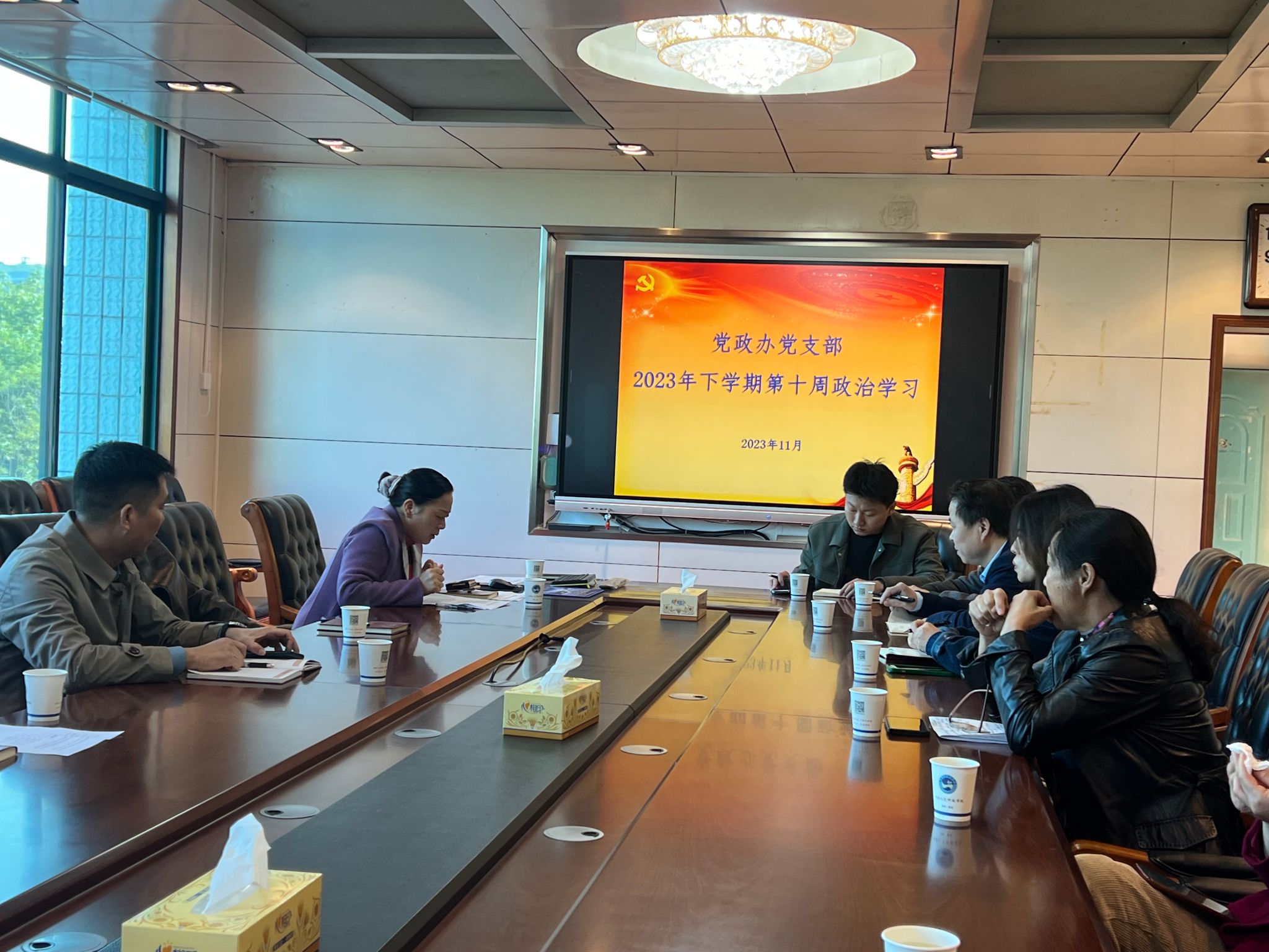 11月17日上午党政办党支部在明德楼404开展政治学习。支部书记李玲军主持,唐红辉馆长领学。
