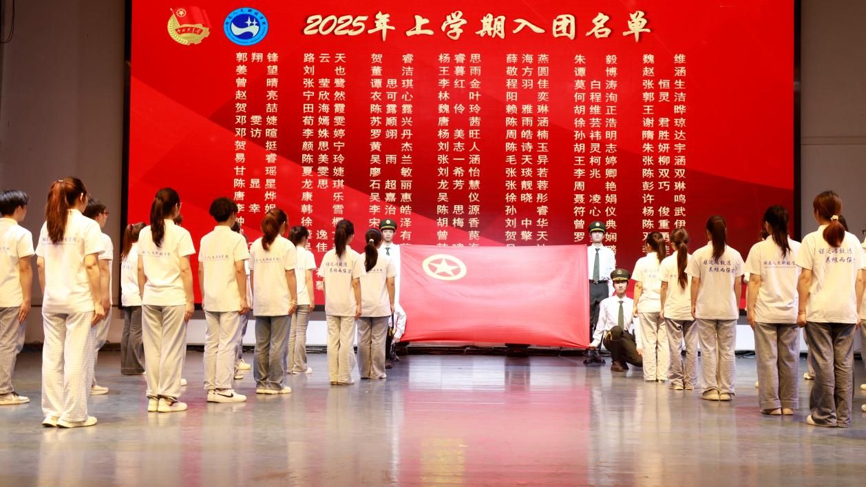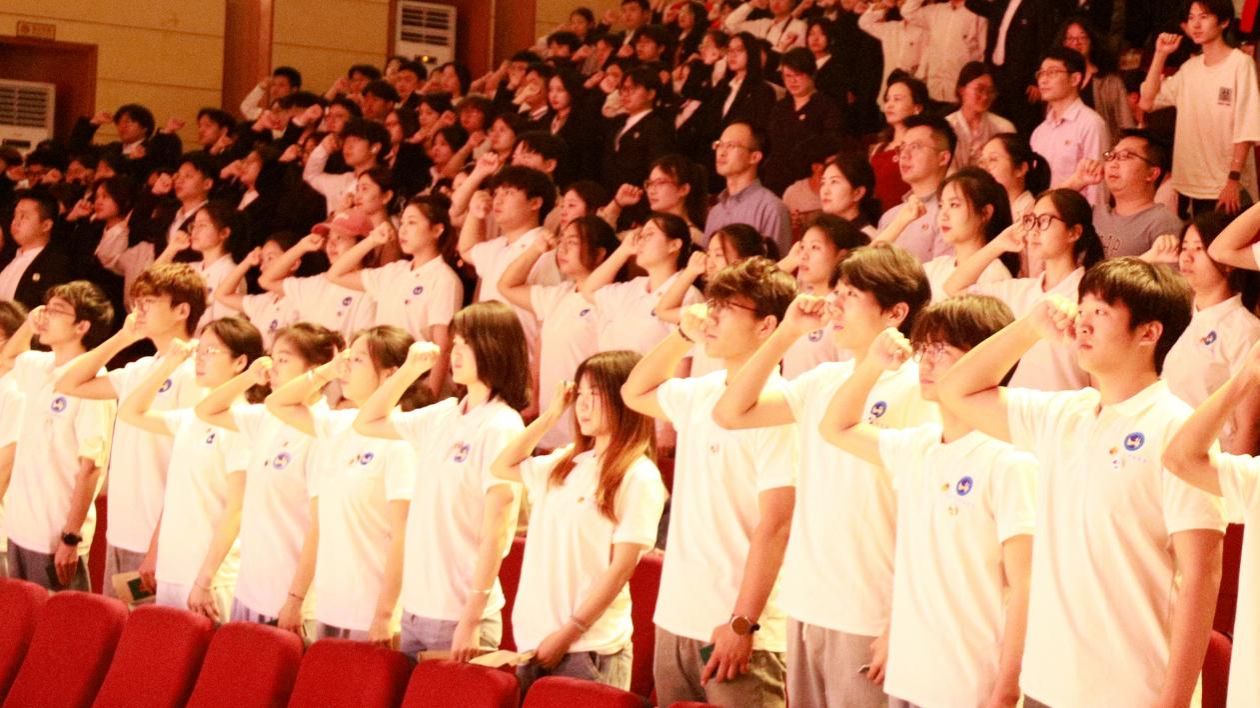 题为《青春 奋斗 担当》的主题视频拉开大会帷幕。入团仪式中,与会领导老师为新团员佩戴团徽、颁发团员证;团委学生副书记李焯华带领全体团员面对团旗庄严宣誓。
