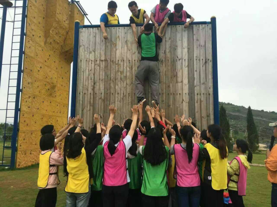 早上十点,在微风徐徐中拓展训练拉开序幕。开始前,在教练的安排下大家进行了“找友人”的破冰活动,旨在攻破人与人之间的隔阂,建立彼此信任的基础,营造团队快乐和谐的氛围。而后,大家随机分成三个小组,进行小组展示,进行了“鼓动人心”的PK对擂,再到“高空断桥”的自我突破项目,最后完成了“毕业墙”群体合作活动。每一项目都是对团队的一个挑战,所有人团结一心,团队协作的精神才能得以升华。