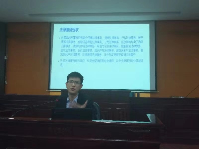杨慎勇律师的讲座题目是《法律职业与法律思维——以律师行业为例》。讲座内容包括湖南省律师职业发展现状、娄底市律师职业发展现状、法学理论在律师执业中的运用、律师职业的基本能力要求。