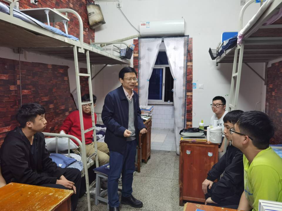 陈志国进入寝室后,同学们热情地打招呼、问好,现场氛围其乐融融。随后陈志国与同学们围坐在一起展开亲切交谈。他一一询问同学们的学习、生活情况,事无巨细。并对从山东远赴娄底求学的同学表示深切关怀,希望他能够适应新的环境,拓展视野,取得新的收获。