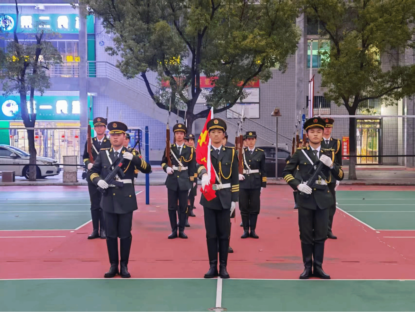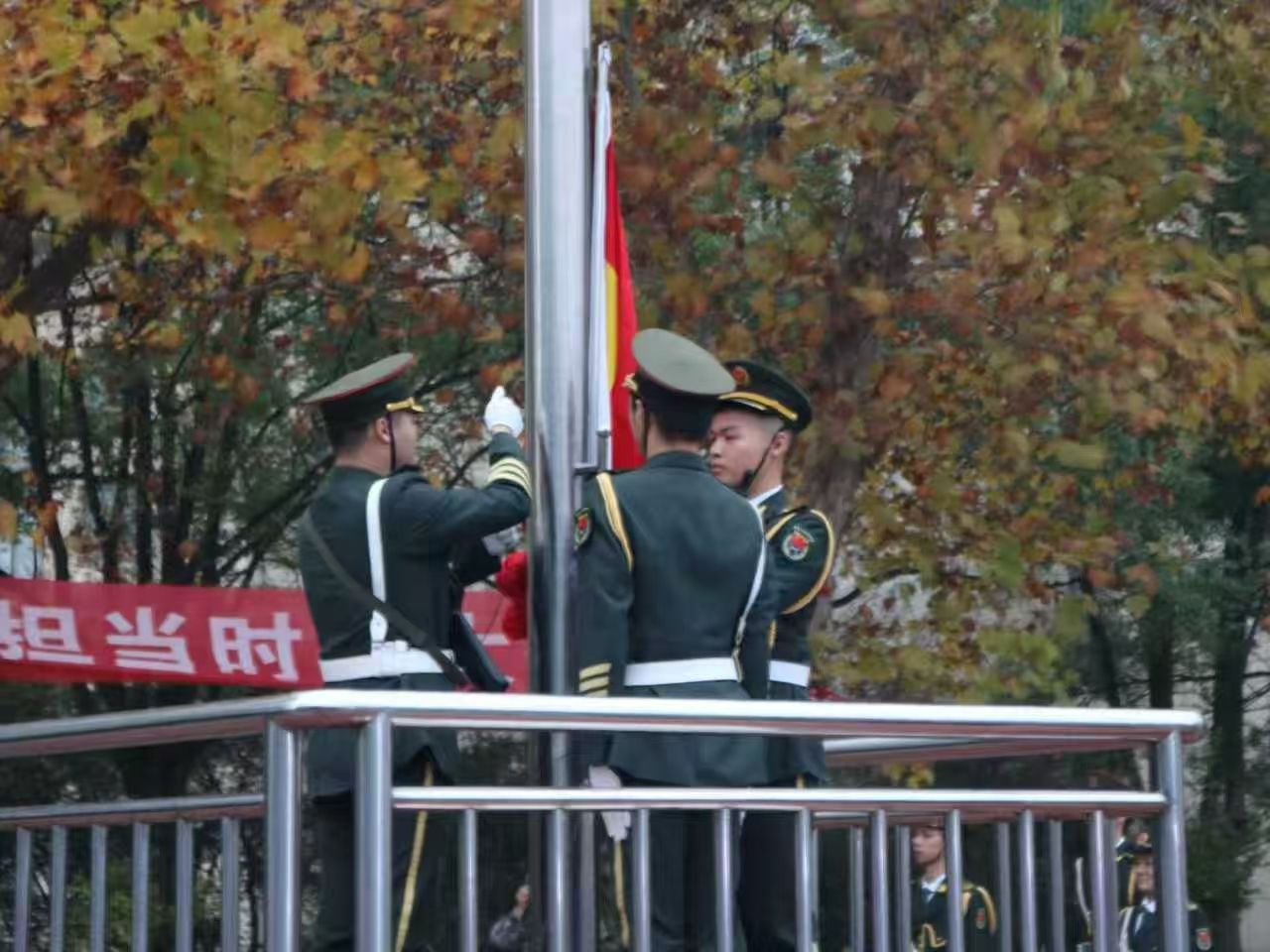 晨光中,国旗护卫队步伐铿锵,护送国旗。在雄壮的国歌声中,全体师生肃立注目,五星红旗冉冉升起,现场庄严肃穆。
