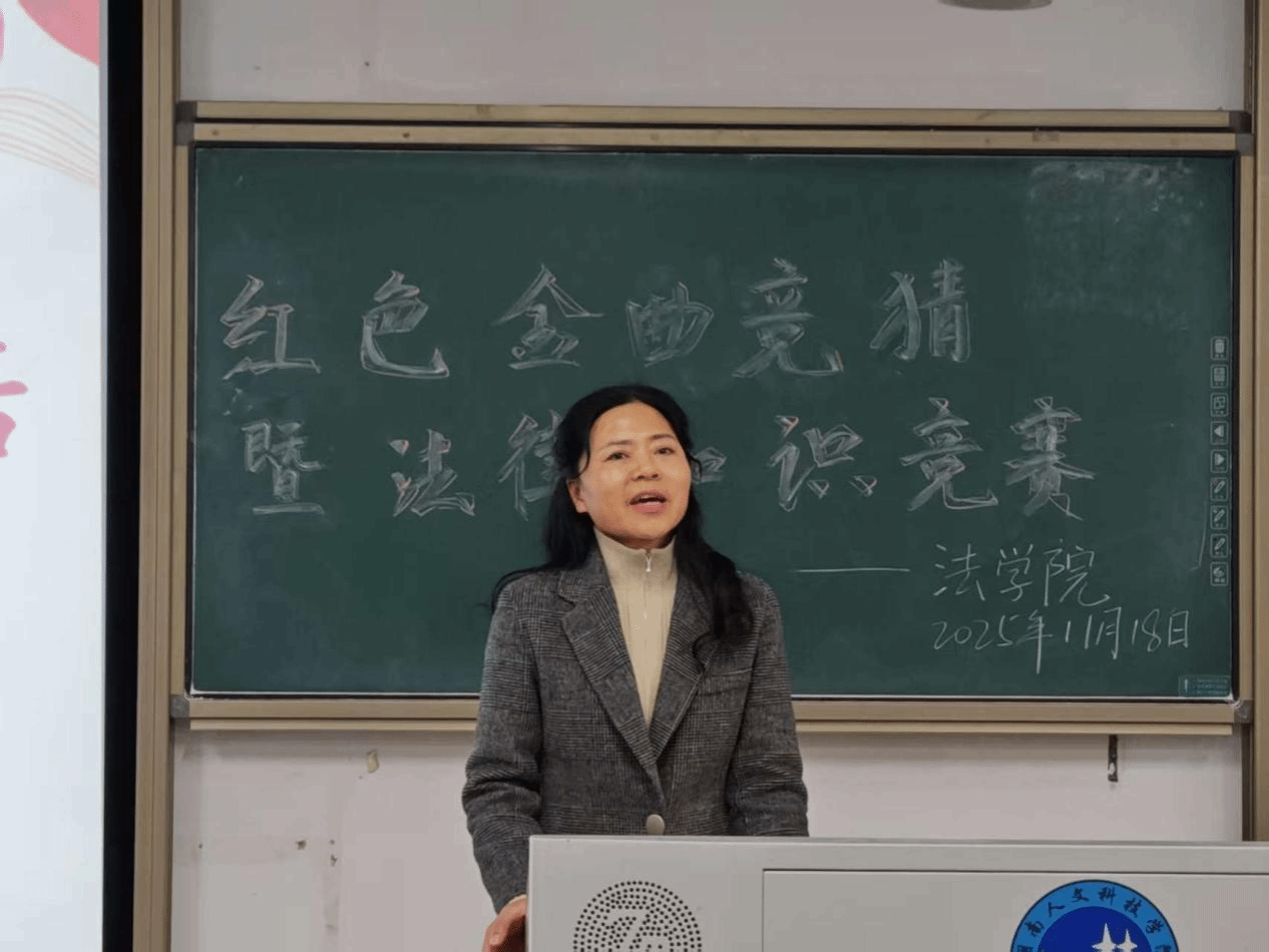 11月18日下午,法学院在致远楼301教室成功举办“红色金曲竞猜暨法律知识问答”决赛。本次活动作为学院学风建设系列活动的重要一环,融合红色文化与专业学习,以“音乐+法治”的创新形式吸引了广大学生参与。学工办主任陈玲老师、学生会主席团成员、党员发展对象、入党积极分子、团学会各部门部长及2025级学生共同参加。