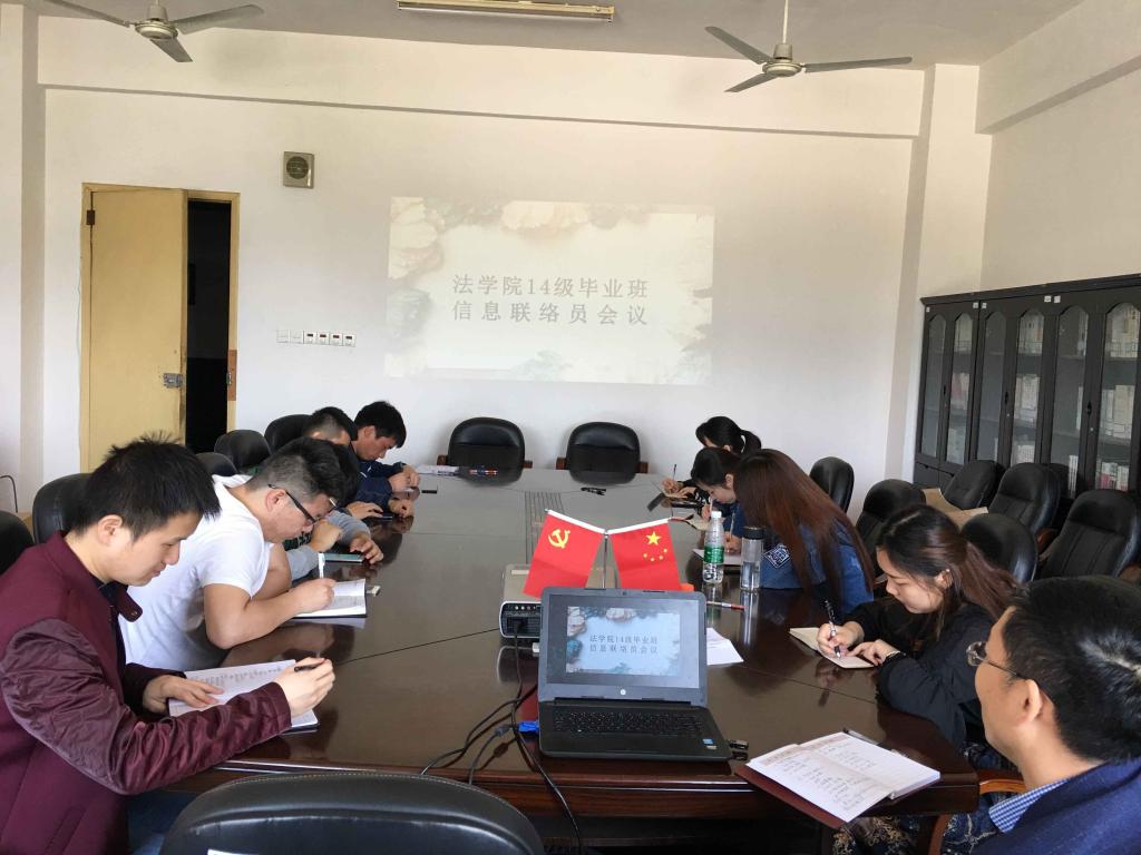 2018年4月18日,法学院在致远楼308举行了14级毕业班信息联络会议,参与会议的有党总支副书记刘依归,辅导员郭璐、宋元烨,以及14级班长、学委、团支书。