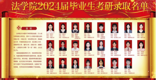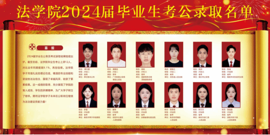 我院2024届毕业生共299人,就业人数248人,就业率82.94%,较去年同期上涨1.47%,其中法学83.96%,社会工作78.31%;继续深造23人,基层工作13人,自主创业4人,灵活就业34人,正式签约221人。其中考研、考公等高质量就业不断提升,2024届毕业生考上公务员12人,考上研究生23人。