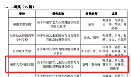 根据《关于组织开展2022年湖南省高校大学生暑假社会实践心理调研的通知》,湖南省高校大学生心理健康教育研究会为进一步发挥社会实践在改进大学生思想政治教育中的重要作用,号召各高校学生主动参与社会心理服务体系建设,激发大学生的社会责任感与时代使命感。经单位选拔、专家评审,beat365正版唯一官网必一社会工作专业陈佳容、罗七莲、曹颖琪、左燕婷、路新宇同学撰写的《关于农村留守儿童性心理教育与预防性侵害的调查报告》在法学院袁明、心理咨询中心秦雨晴老师指导下,荣获湖南省高校暑期社会实践心理调研报告二等奖!