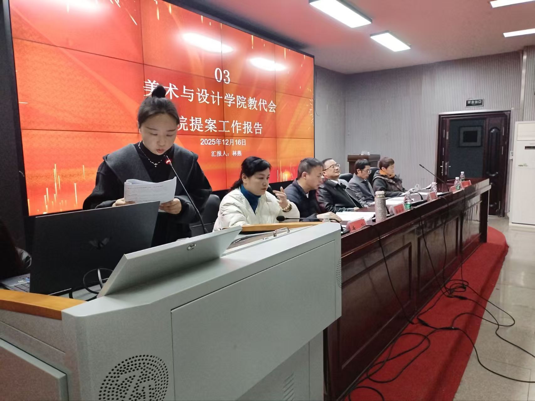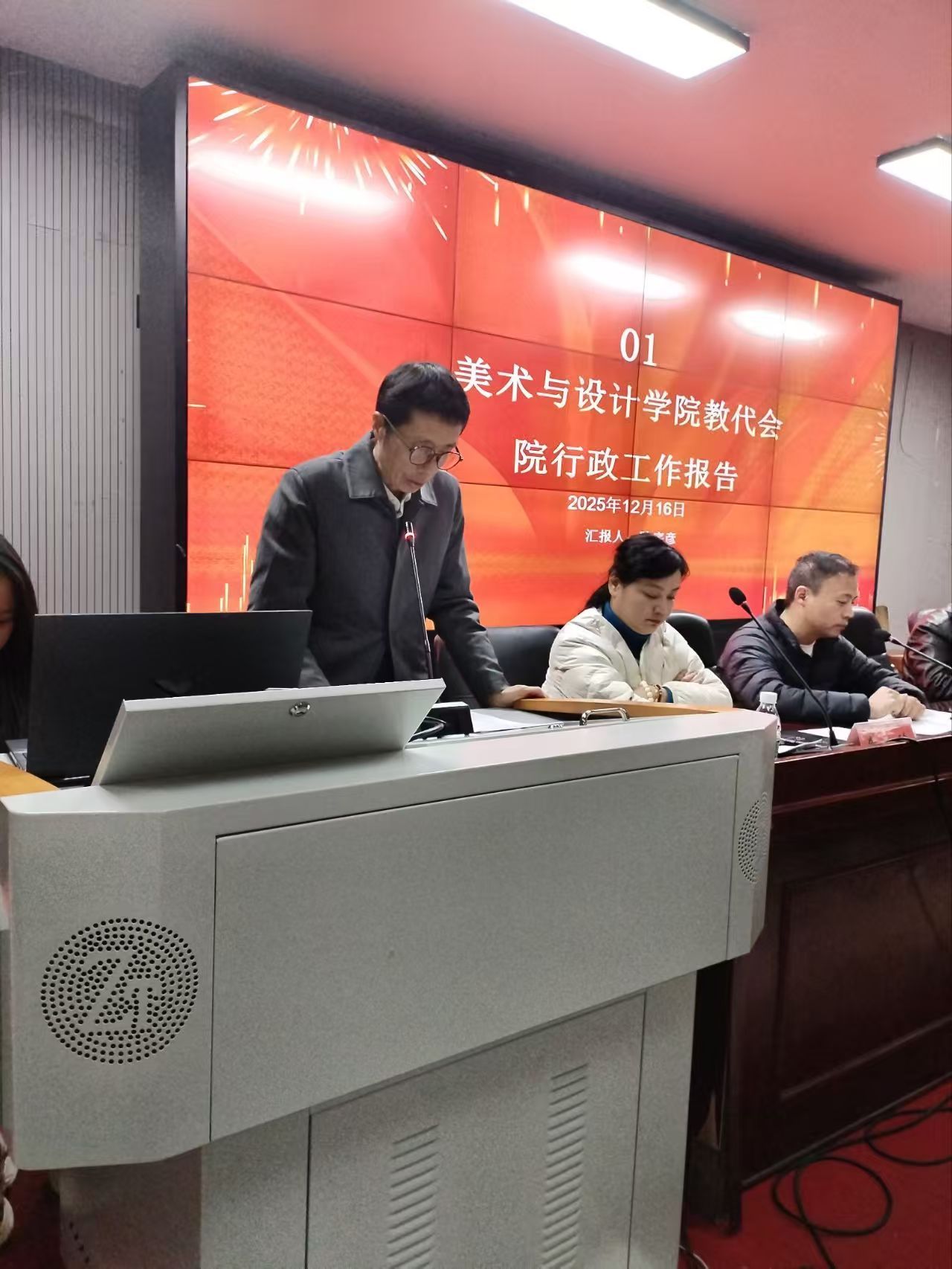 会议在庄严的国歌声中拉开帷幕。会上,美术与设计学院院长陆序彦作院行政工作报告,全面回顾学院近期行政工作开展情况、取得的成果及未来发展规划。