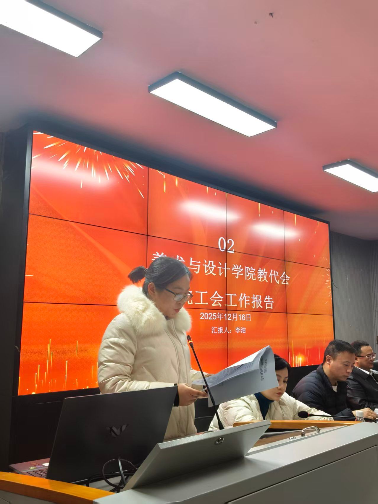 随后分工会李洁作了强化思想引领,凝聚教职工力量的报告,报告全面回顾 2024 年工会工作成效,明确 2025 年工会将聚焦教育、建设、参与、维护四项职能,立足服务师生、服务教学的核心定位,为学院高质量发展注入工会力量。
