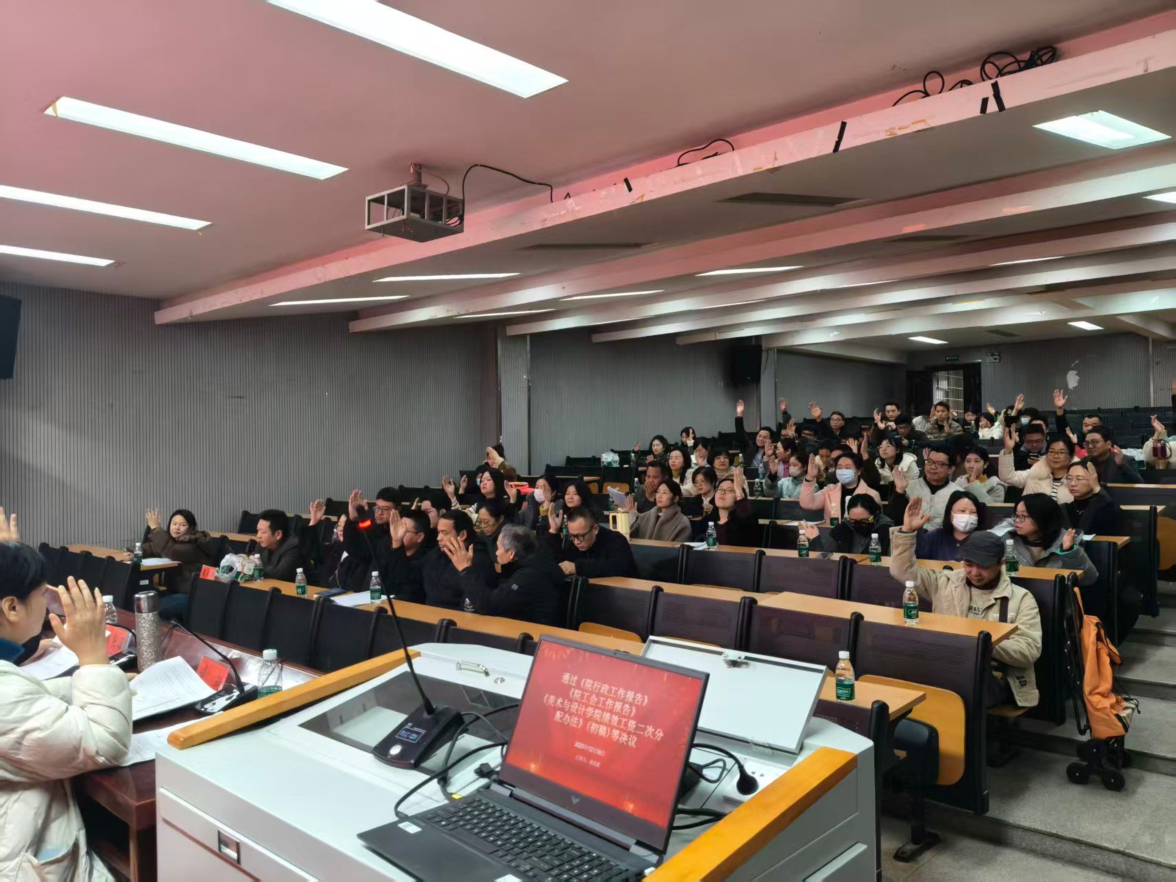 下午4时,大会再次集中,审议并通过了院行政工作报告、院工会工作报告及《美术与设计学院绩效工资二次分配办法(初稿)》等决议。最后,党总支书记阳立新致闭幕词,对大会的顺利召开表示祝贺,强调学院将认真吸纳代表建议,持续推进各项工作提质增效,此次教代会圆满落幕。