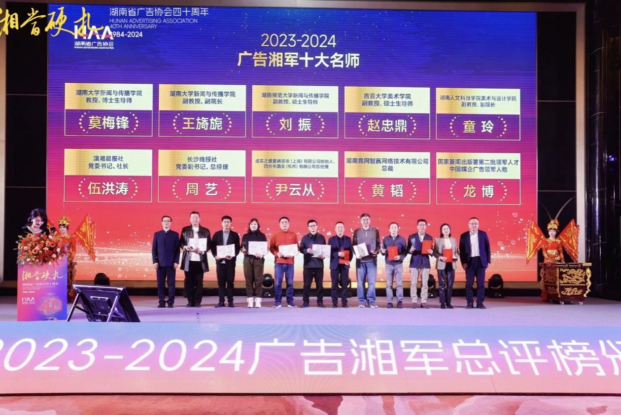 1月19日,湖南省广告协会成立四十周年纪念大会暨2023-2024广告湘军总评榜颁奖典礼在长沙举行,盛会吸引了广告界精英、专家学者及行业领袖的参与,beat365美术与设计学院副院长童玲教授荣获“广告湘军十大名师”称号。