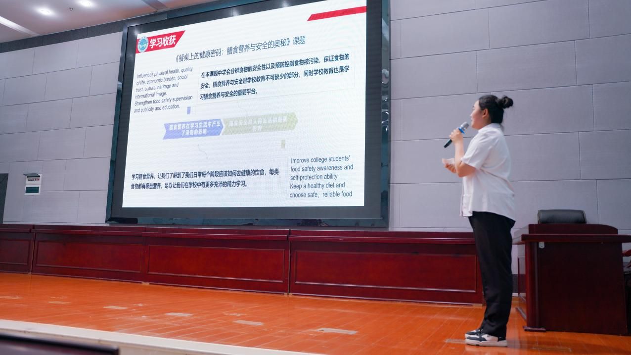 会议开始,国际交流处(港澳台事务办公室)处长黄敏致辞,她详细介绍了该项目的基本情况,引用习近平总书记在二十大报告中的关键词,突出了党和国家对推进高水平对外开放及国际化人才培养的重视,希望同学们能够强化理论知识,积极参加实践活动,努力向具有国际视野的应用型复合型人才靠拢。汤映景同学作为第一批拿到由教育部中外文化交流中心颁发的结业证书的往届学员代表在会上发言,并用她的故事激励每一位在场的同学。随后,50名学生分成5个项目组依次上台,通过PPT展示、现场讲解、互动问答等多种形式,向与会者展示了他们在可持续发展、国际关系、跨文化艺术、音乐康复治疗、膳食营养与安全等领域的创新实践成果。最后,国际班指导教师蒋成做总结发言,肯定了国际班一年来取得的成绩,也指出了目前存在的不足之处,同时对同学们今后的学习提供了新的努力方向。