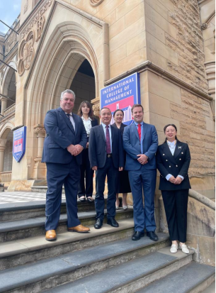 (与悉尼国际管理学院主席兼董事总经理(右二)、副校长(左一)合影)