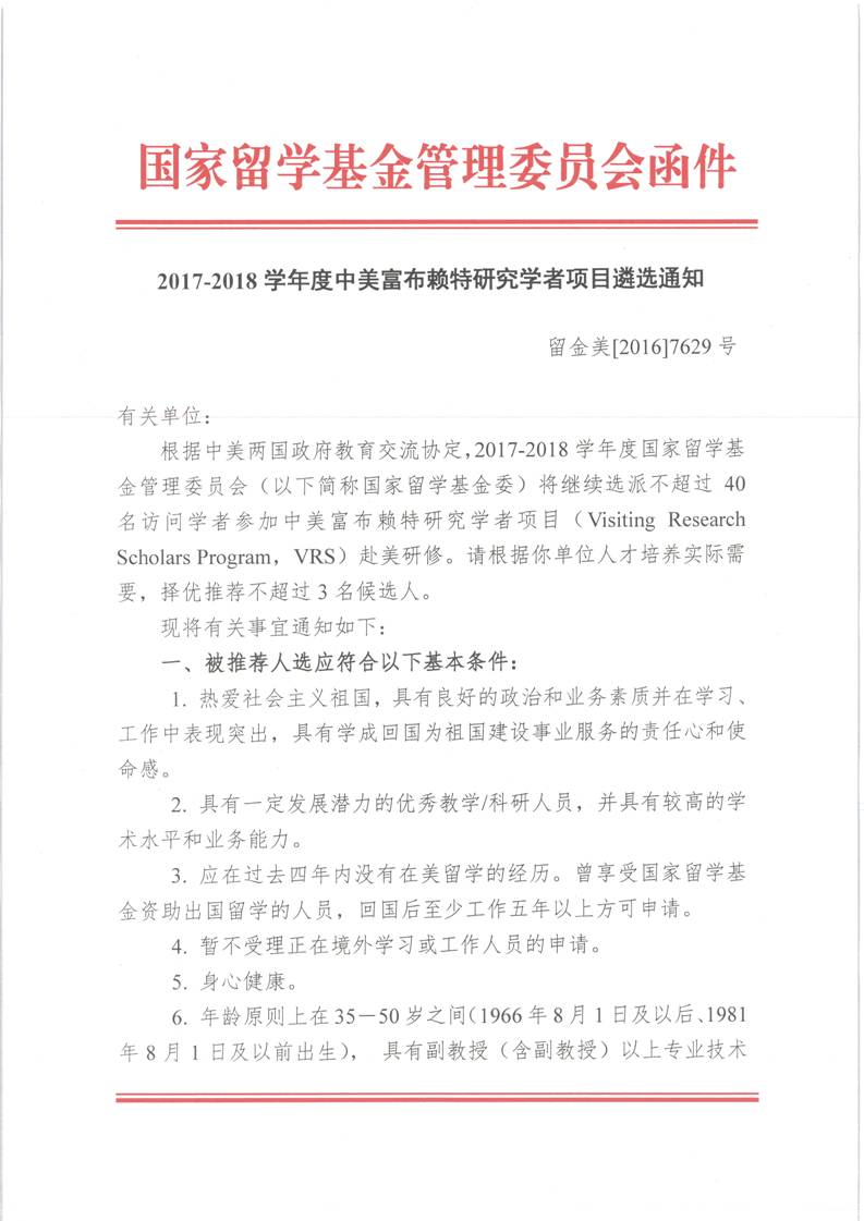 现转发国家留学基金委《2017-2018学年度中美富布赖特研究学者项目遴选通知》。根据省教育厅的要求,请有意愿申报的教师仔细阅读通知和附件内容,于6月3日前完成国家留学基金委信息平台申报(暂不进行美方网站申报)并将纸质材料交至成德楼408国际合作与交流处,由我处统一报送湖南省教育厅。