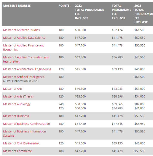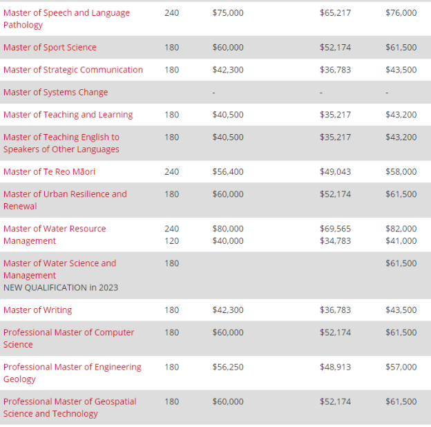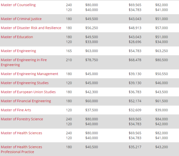 硕士可选专业:商业硕士、商业信息系统硕士、金融管理硕士、专业会计硕士、战略沟通硕士、应用翻译与口译硕士、南极研究硕士、应用数据科学硕士、应用金融与经济学硕士、建筑工程硕士、人工智能硕士、听力学硕士、土木工程硕士、计算机辅助语言学习硕士、刑事司法硕士、灾害风险和恢复力硕士、教育硕士、工程硕士、消防工程硕士、工程管理硕士、交通工程硕士、欧盟研究硕士、金融工程硕士、美术硕士、林业科学硕士、健康科学硕士、人机界面技术硕士、国际关系与外交硕士、数学科学硕士、音乐硕士、产品设计硕士、产品创新硕士、公共卫生空间分析硕士、专业教学硕士、言语和语言病理学硕士、运动科学硕士、系统变革硕士、城市复原力与更新硕士、水资源管理硕士、水科学与管理硕士、写作硕士、计算机科学专业硕士、工程地质专业硕士、地理空间科学与技术专业硕士等
