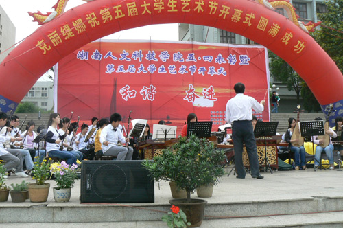 5月4日下午3:00,学院领导与在校的青年大学生欢聚在海园广场,以“五·四表彰暨第五届大学生艺术节活动”为载体,共同度过了第59个五·四青年节。活动由院团委主办,音乐系团总支承办。院党委书记黄懿斌同志,党委副书记、院长姜正国同志,党委副书记、副院长郭军同志,党委委员、纪委书记李尚益同志,党委委员、工会主席邓和秋同志,党委委员、党办院办主任李高海同志,院长助理刘铁铭、蒋建初同志,组织部、院团委、学生处、宣传部、武保处及各系领导出席了此次盛典。