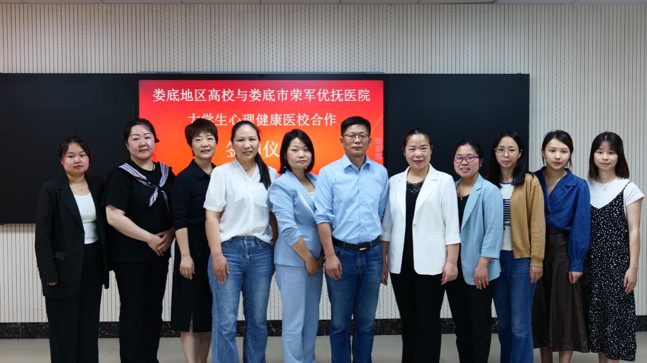 6月6日下午,娄底地区高校与娄底市荣军优抚医院大学生心理健康医校合作签约仪式在beat365心理健康教育与咨询中心举行。娄底市荣军优抚医院副院长张岸、心理科与儿少科主任孙艳、精卫中心主任龚霞芳,beat365正版唯一官网必一学生工作部副部长谢四元,娄底职业技术学院学生工作部副部长阳帆,娄底潇湘职业学院学生工作处副处长肖艳以及三所高校心理中心专职教师出席本次签约仪式。