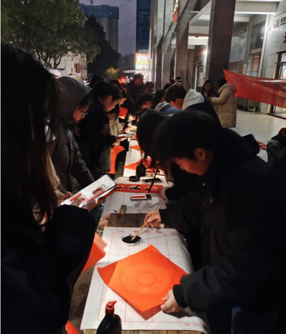 社区过后,活动阵地先后转移到了学校食堂和逸夫艺术楼,将写赠春联活动推向了高潮。党员们再次拿起毛笔,为等待领取春联的学校师生和附近居民,持续一轮又一轮的创作,他们根据不同需求,制作了各具特色的春联,每一副都寄托着对新的一年美好祝愿。