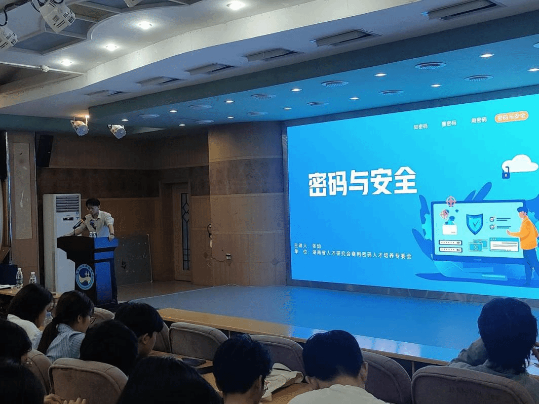 为深入学习贯彻总体国家安全观,在第十个全民国家安全教育日(4月15日)来临之际,由湖南省国家密码管理局与娄底市国家密码管理局共同指导,学校承办的以“贯彻实施《中华人民共和国密码法》走深走实五周年”为主题的“密码安全高校行”活动在养根楼报告厅举行。活动由信息学院党总支副书记朱舒腊主持,100余名学生参加。