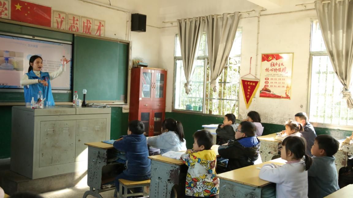 科学实验互动是本次特色课堂的重头戏,4个与“双碳”理念相关的趣味实验依次开展。党员志愿者们被分为4组,轮流带领孩子们体验丁达尔现象实验、火箭发射小实验、简易饮水装置和水往高处流实验。党员志愿者们结合实验现象,用通俗易懂的语言讲解科学原理,并联系“双碳”理念,引导孩子们在生活中践行节能环保。
