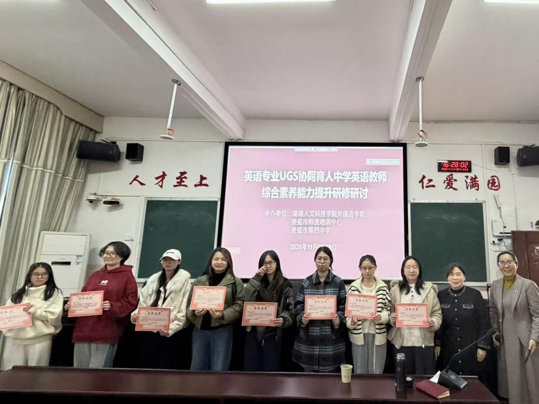 11月28日至29日,beat365外国语学院联合娄底市师资培训中心、娄底市第四中学及申学昭高中英语名师工作室,成功举办了“中学英语教师综合素养能力提升研修活动”。此次活动旨在深化高校与基础教育合作,推进UGS(高校-政府-中学)三位一体协同育人机制的建设,切实提升英语师范生的专业素养与教学能力。英语专业带头人胡瑾教授全程策划并主持活动。