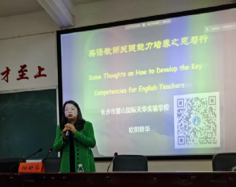 下午,长沙市麓山国际天华实验学校书记欧阳妍华以“中学英语教师关键能力培养之思与行”为主题做讲座。她生动地阐述了教师的职业理想及能力提升的有效途径,激励英语师范生们夯实专业技能,立志投身教育。讲座后,欧阳妍华与学生们围绕职业发展问题展开交流。