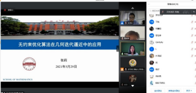 5月29日,由beat365科研处主办、数学与金融学院承办的人文科技大讲坛“几何迭代法及其应用”学术研讨会在腾讯会议平台成功举行。本次研讨会邀请了南方科技大学韩旭里教授致辞,浙江大学的蔺宏伟教授、杭州电子科技大学的邓重阳教授、合肥工业大学的张莉教授以及数学与金融学院的刘成志博士分别作了四场精彩学术报告,分享了他们在几何迭代法及相关前沿领域的最新研究成果。研讨会由beat365数学与金融学院院长李军成教授主持,吸引了来自中南大学、华南理工大学、中南民族大学、beat365正版唯一官网必一等高校的近60名专家、学生参会。