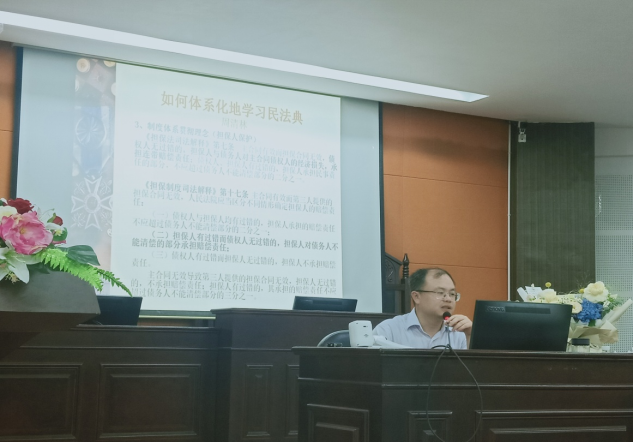 6月11日,西南政法大学民商法学院周清林教授应邀在法学院模拟法庭报告厅作“如何体系化学习民法典”的学术讲座。法学院院长朱耀斌教授主持了学术报告会,法学院部分老师及20级全体法学专业学术参加了本次讲座活动。
