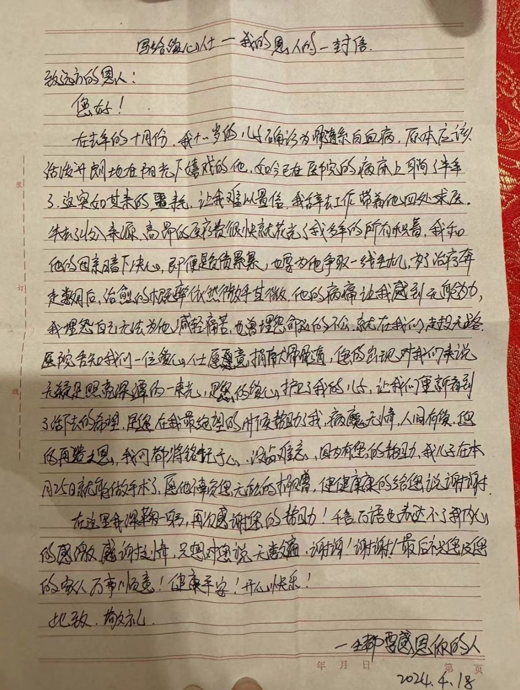 感谢信中写到:“您的出现对我们来说无疑是照亮深潭的一束光。病魔无情,人间有爱,您的再造之恩,我们都将铭记于心,没齿难忘!”