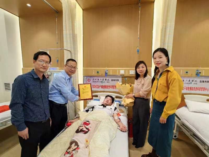 为了鼓励学生博爱无私的善举,带着党委书记刘铁铭、校长盛明科的嘱托,党委委员、副校长陈志国专程赶往长沙看望蒋永芳并全程陪他完成采集,教育学院党总支书记陈功平等也一直在现场陪伴。