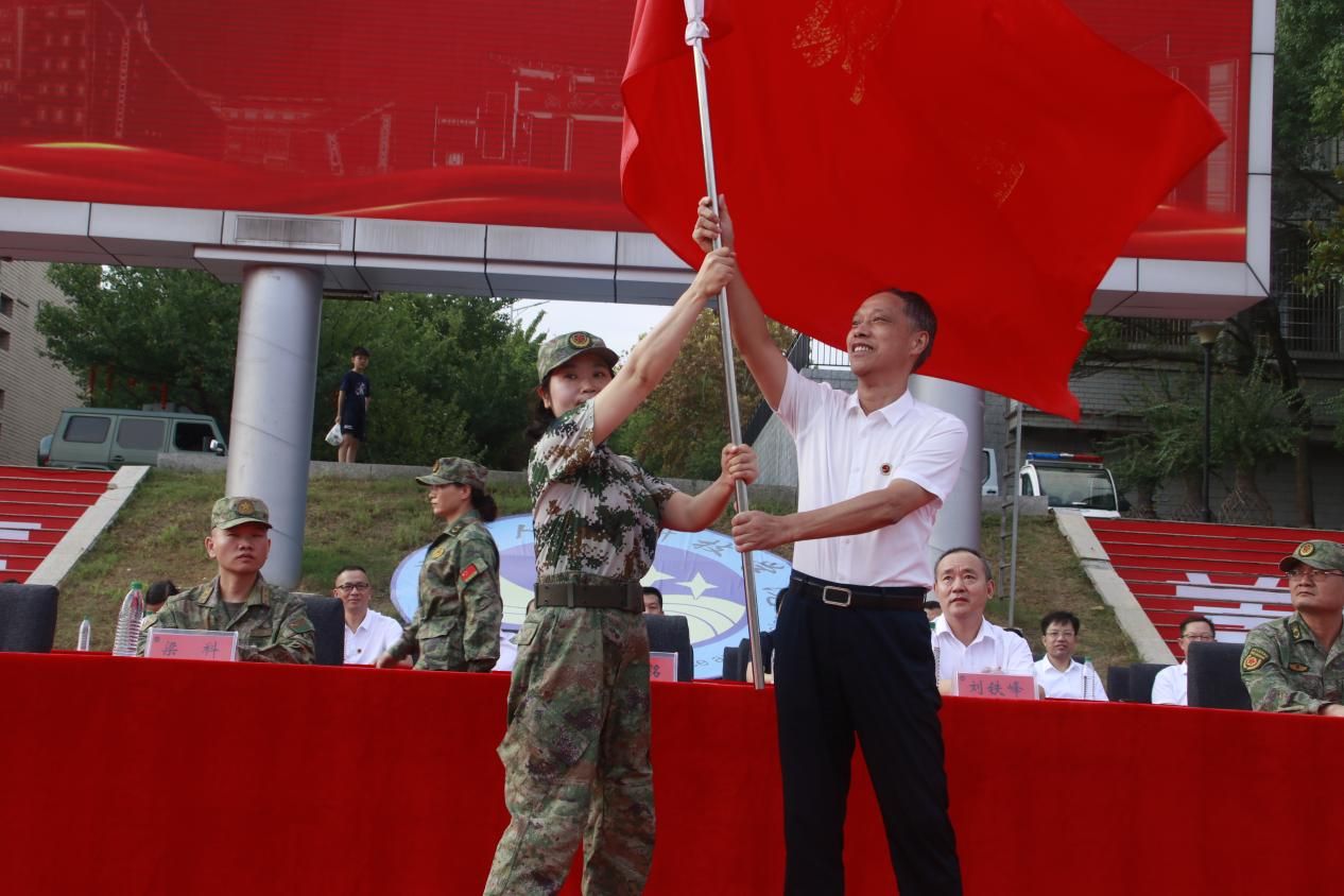 刘铁铭向军训团参谋长谢四元授旗,并宣布军训开训令。