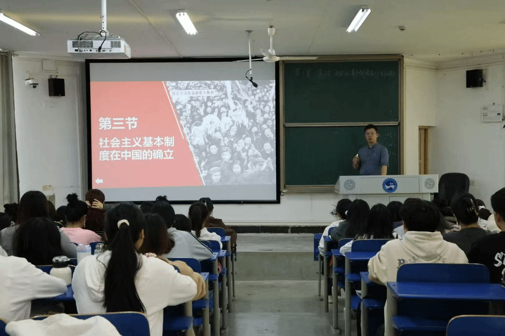 公开课由周浩博士主讲。周浩以“社会主义基本制度在中国的确立”为主题进行授课展示,他带领同学们简要回顾了党在过渡时期总路线的主要内容和特点,从而引入社会主义基本制度在中国的确立及理论依据,通过展示生动的历史图片、阐释经典的历史事件,从社会生产力发展、人民当家作主、鼓励支持其他国家民族独立以及再次印证马克思列宁主义真理性等四个维度深入浅出地阐述了确立社会主义基本制度的重大意义。同学们全程聚精会神,深切感受到社会主义基本制度的确立给中国带来的翻天覆地的变化,对社会主义改造“过急过快论”“过早超越论”等论断的讨论十分热烈。
