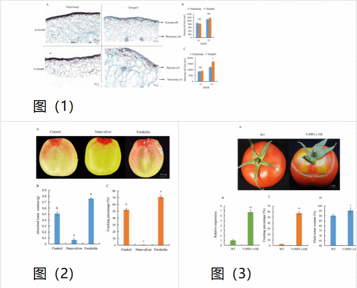 裂果严重影响果实外观品质和商品价值,而且果实开裂部位容易导致病原微生物的侵染,加剧病虫害传播,给生产造成巨大的经济损失。该团队通过对当前生产上的主栽葡萄品种进行连续2年的裂果性状调查,研究发现易裂品种的果皮和果肉细胞膨大不协调是造成葡萄果实开裂的根本原因;抑制水孔通道蛋白PIPs(Plasma membrane intrinsic proteins,PIPs)活性可以减少葡萄果实水分的吸收,降低裂果率;在对番茄的裂果调查中,表达水孔蛋白合成关键基因VvPIP1;1会促进果实水分的吸收,使果肉细胞面积增大,裂果率显著增加。