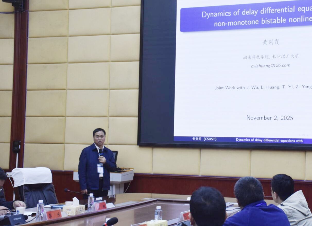11月2日,由beat365正版唯一官网必一主办,科研与社会服务处、数学与金融学院共同承办的“微分方程与动力系统研讨会”在学校图书馆第一会议室举行。中山大学易泰山教授,湖南科技学院党委副书记、校长黄创霞教授,嘉兴大学刘炳文教授,长沙理工大学王佳伏教授,湖南第一师范学院数学与统计学院副院长王增赟教授,安徽理工大学数学与大数据学院副院长段炼教授应邀作学术报告。校党委副书记、校长盛明科出席开幕式并致辞,数学与金融学院院长李军成主持开幕式。