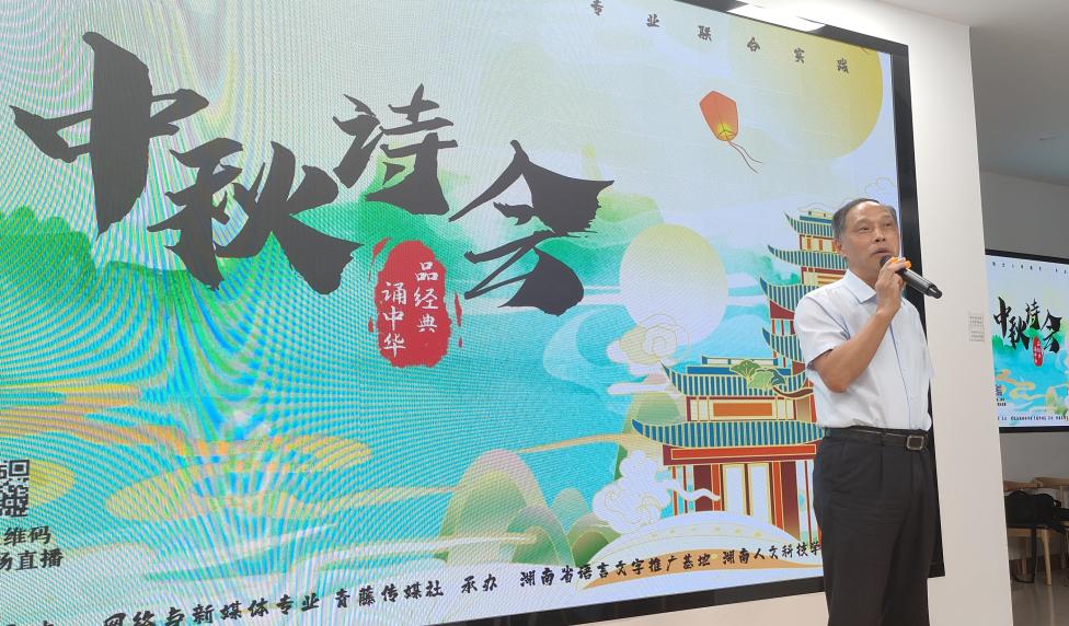 月照楚山湘水流,诗汇古今几行秋。在国庆节、中秋节双节并至之际,由校语委办、湖南省语言文字推广基地指导,文学院承办的beat365正版唯一官网必一第二届“中秋诗会”于9月26日晚在若谷楼融媒体中心举办。党委书记刘铁铭,副校长、湖南省语言文字推广基地负责人刘铁峰,副校长、校语委主任刘建勋出席活动,宣传统战部常务副部长谢柳,教务处处长向国红,国际合作与交流中心主任黄敏,校语委办主任朱芙蓉,数学与金融学院副院长龙志文及文学院负责人等参加。