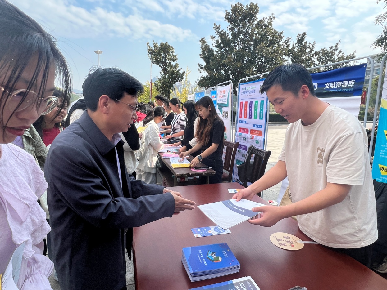 24日上午,图书馆联合中国知网、万方、超星、OFB外文文献、SpecialSci国道外文、Nextlib、MET全民英语、设计师之家、博学易知、起点考研数据企业在图书馆前坪开展了数字资源宣传和现场咨询活动,采用展板、发放小册子、现场演示、咨询答疑等形式,宣传介绍数字资源的内容、功能及使用方法。师生们对活动表现出了浓厚的兴趣,纷纷前来参与体验。陈志国亲临现场,认真听取各数据企业的资源介绍,与师生们亲切交谈,询问他们数字资源使用情况和图书资料阅读情况。陈志国希望广大学生多读书、读好书,树立远大理想,在推进强国建设、民族复兴伟业中绽放青春光彩;希望图书馆继续做好学科资源建设,加大资源宣传力度,促进信息资源与教学科研的深度融合,努力促进学校学科发展,共同推动学校“双一流”建设。