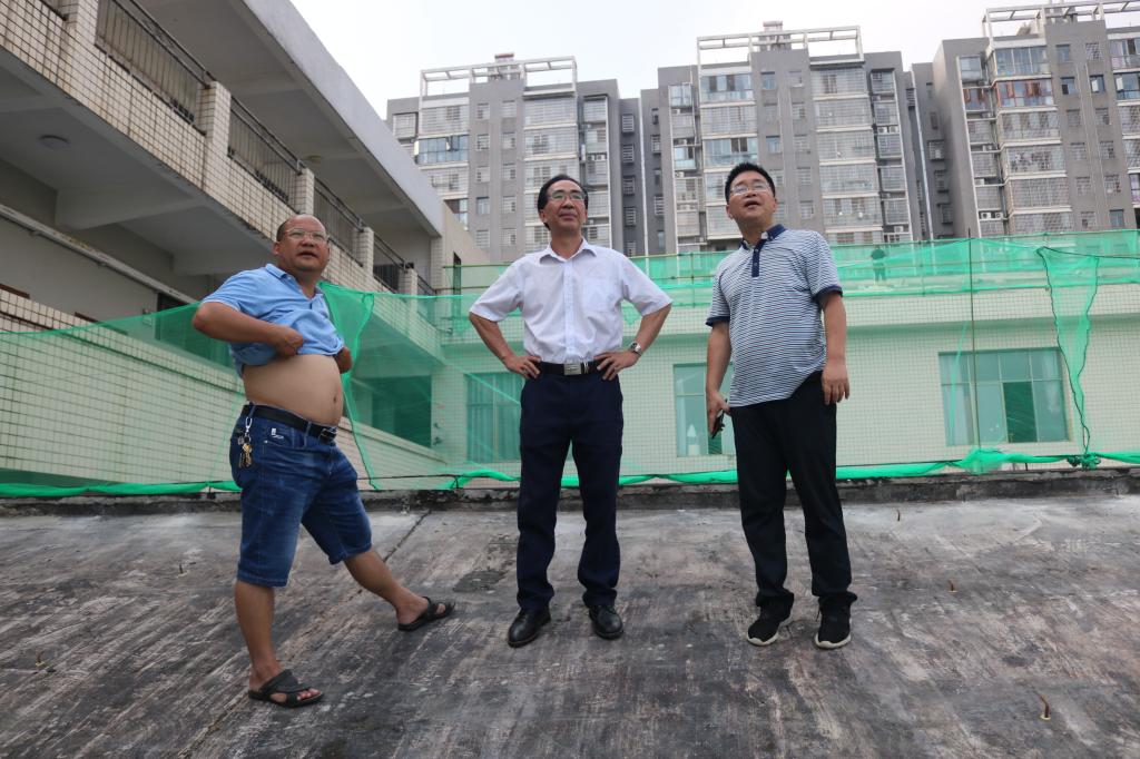 | 蒋建初一行在逸夫楼屋顶改造工地检查 |