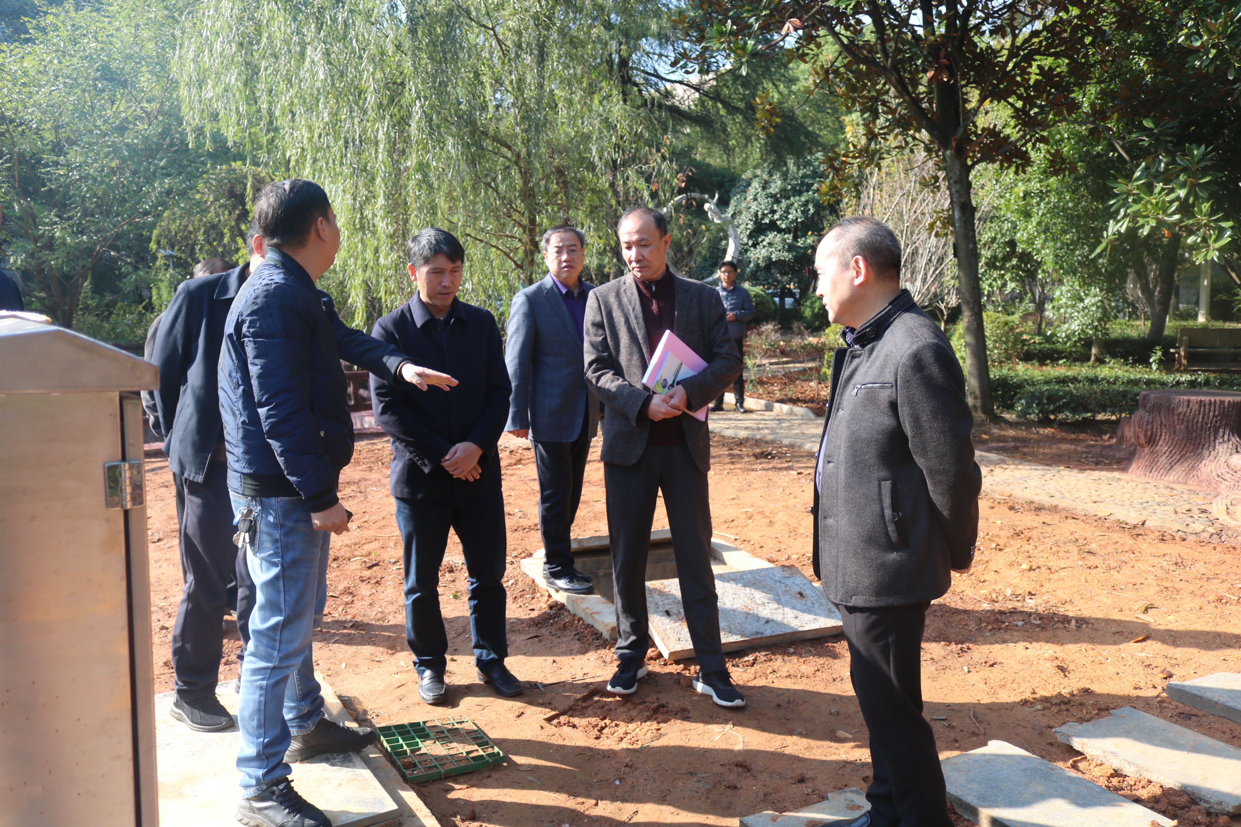 | 刘铁峰陪同专家组检查雨水收集和喷灌系统 |