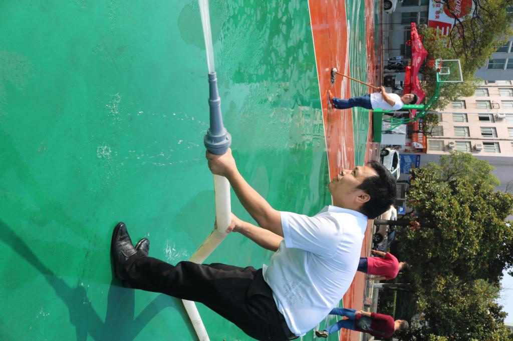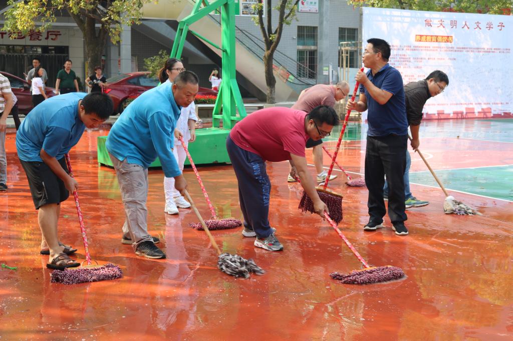 参与活动的党员和职工都不怕脏和累,认真仔细地擦洗宇光球场的PU塑胶地面,使得球场地面焕然一新。